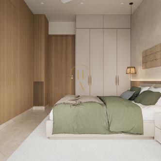 The master bedroom embraces a modern Scandinavian design with an emphasis on clean lines, warm tones, and refined textures. A soothing palette of beige, oak, and muted greens creates a calm yet sophisticated atmosphere. The highlight of the space is the concealed door that blends seamlessly into the wooden fluted wall, leading to the bathroom, a thoughtful detail that enhances both aesthetics and functionality.